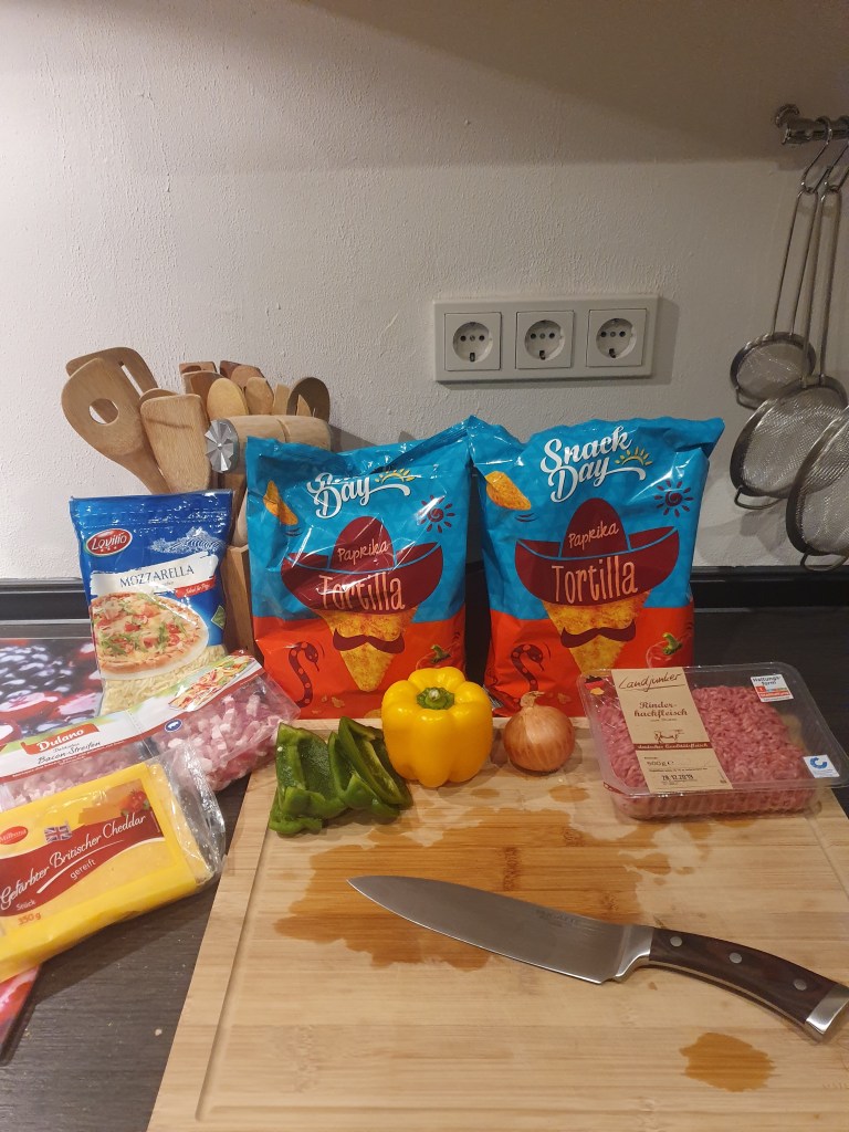 Zunächst etwa die Hälfte der Tortillachips in die Pfanne geben und mit der Hälfte des Hackfleisches bedecken, die Hälfte des Bacons daraufstreuen und die Hälfte des Gemüses grob verteilen. Anschließend großzügig Barbecuesoße darüber geben und den Cheddar und den Mozarella darüber streuen. Anschließend den Vorgang wiederholen.