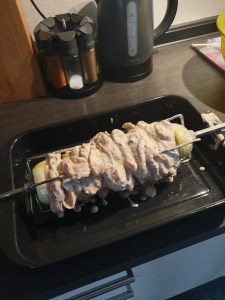 Nach der Ruhezeit kann der Spieß gesteckt werden. Dazu zunächst eine große Zwiebel (idealerweise eine Metzgerzwiebel) halbieren und auf den Spieß stecken. Die Zwiebel verleiht dem später gesteckten Komplex eine gewisse Stabilität. Anschließend die Fleischstücke in der Mitte falten (je nach Größe der Stücke) und auf den Spieß aufstecken. Am Ende das ganze mit der anderen Zwiebelhälfte abschließen.