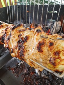 Nun ist der Gyrosspieß bereit für den Grill. Dabei sollte man das Fleisch bei mittlerer Hitze solange angrillen, bis eine Kruste ensteht. Im vorliegenden Fall war dieser Zustand nach ca 45-50 Minuten erreicht. Nun kann die erste Tranche abgeschnitten werden und ist verzehrfertig. Diesen Vorgang kann man bis zum vollständigen Aufbrauchen des Fleisches durchführen.