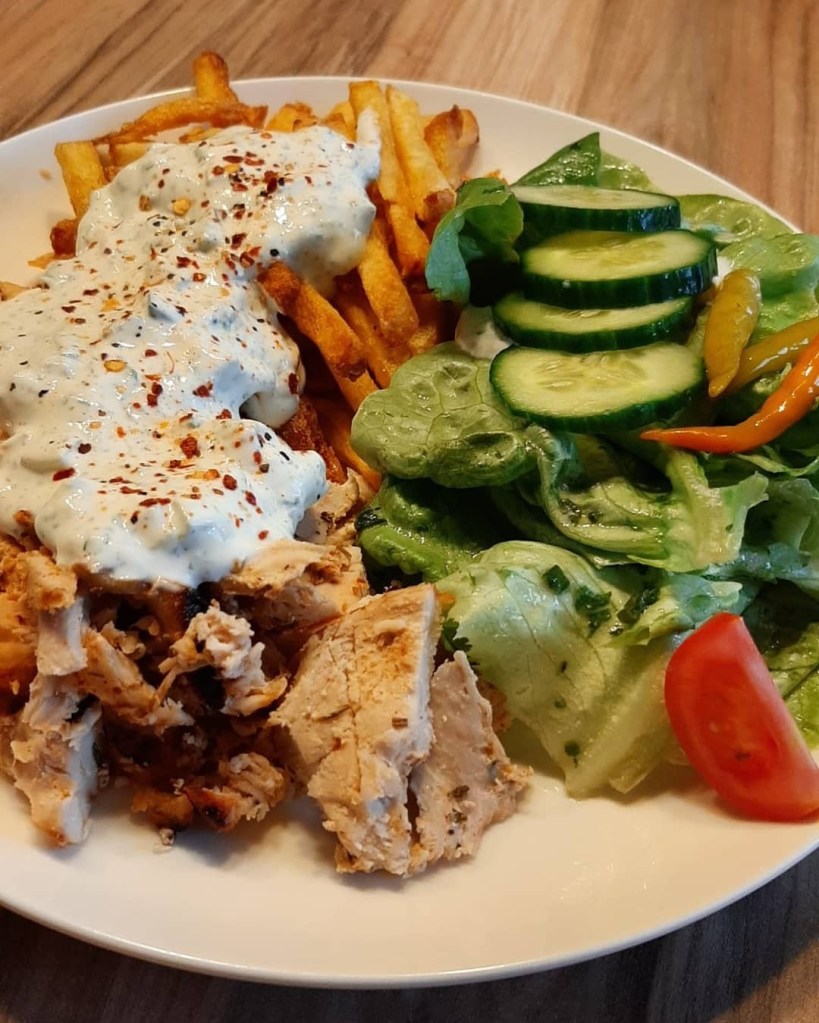 Serviert wird das Gyros idealerweise mit Pommes, Salat und Zaziki oder mit Reis.
