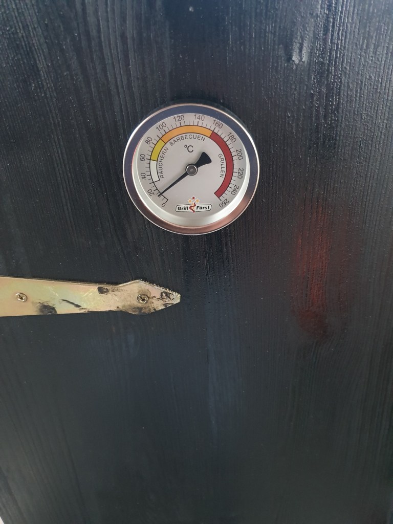 Zur Temperaturüberprüfung (die Temperatur sollte beim Kalträuchern 22-25°C keinesfalls übersteigen!) habe ich noch ein Deckelthermometer für Grills eingebaut.