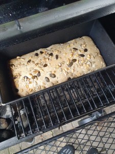 Den Teig einfach in eine Kastenform oder einen feuerfesten Topf, bzw. Dutch Oven geben und in den Smoker stellen und ca. 80 Minuten backen. Dabei ist insbesondere auf zwei Dinge zu achten. Zunächst sollten man grundsätzlich ein Töpfchen mit lauwarmem Wasser mit in den Garraum des Smokers stellen, so bleibt das Brot schön saftig (bei hoher Luftfeuchtigkeit, insbesondere bei Regen ist dies jedoch nicht zwingend notwenig). Zum anderen sollte das Backgut so weit wie möglich von dem Übergang zwischen Garraum und Sidefire-Box entfernt stehen, sodass ein möglicher Flammenüberschlag das Brot nicht berühren kann.