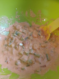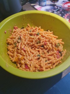 Im Anschluss die Nudeln dazu geben und alles gut vermengen. Den Salat dann für ca. 2-3 Stunden im Kühlschrank durchziehen lassen.