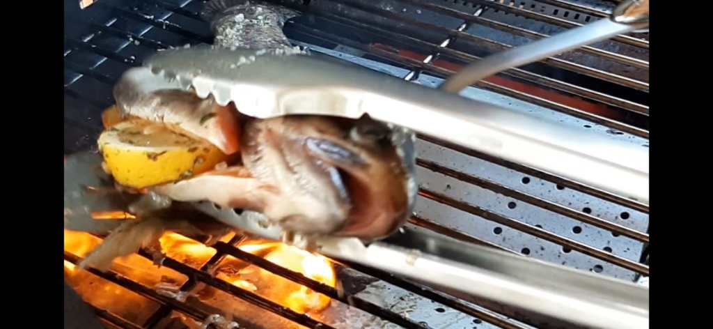 Die Forelle nun im auf ca. 160 Grad vorgeheizten Grill von beiden Seiten scharf angrillen, sodass Röstaromen entstehen. Den Grillrost vorher idealerweise mit etwas Trennspray einfetten, dann ist die Wahrscheinlichkeit, dass die Forelle anklebt geringer. Dennoch sollte man nicht verzweifeln, wenn trotzdem die Haut zu Teilen am Grillrost kleen bleibt, das lässt sich manchma einfach nicht vermeiden.