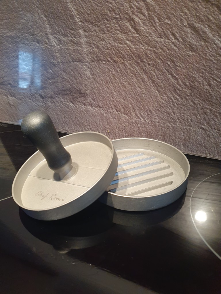 Burgerpressen gibt es in verschiedenen Formen und Farben. Die zwei die sich in meinem Besitz befinden habe ich hier mal abgelichtet: