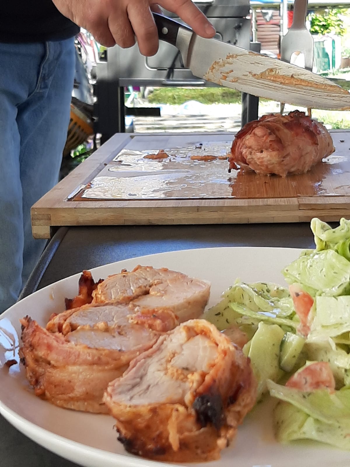 Dieses mediterrane Genusstück ist ein Muss für jeden Fleisch- und Pizzalienhaber. Butterzart und fruchtig-würzig überzeugt der Geschmack auf jeder BBQ-Party. Zutaten: Schweinefilet (mit Filetkopf), hier ca 650g 3 EL Frischkäse (natur) 2 EL Tomatenmark ca. 250 – 300g Bacon 2 TL Pizzagewürz (z.B. Ankerkraut „Pizzagewürz“) 3 EL Magic Dust (oder ein anderes BBQ-Gewürz) Zubereitung: Den„Gefülltes Pizza-Schweinefilet“ weiterlesen